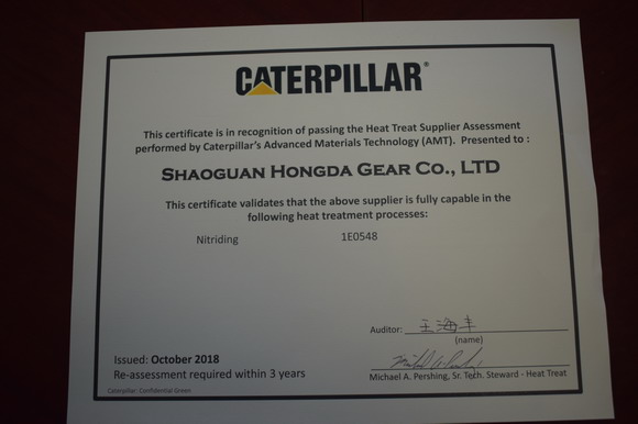 2018年10月31日,卡特彼勒公司总部代表为我司颁发“氮化质量荣誉证书”,我司是国内首家得到该公司认可并颁发荣誉证书的供应商。我司于2009年开始向卡特彼勒公司供应油泵齿和工程机械类产品,多次得到客户的肯定与好评,目前是卡特彼勒公司的银牌供应商。
